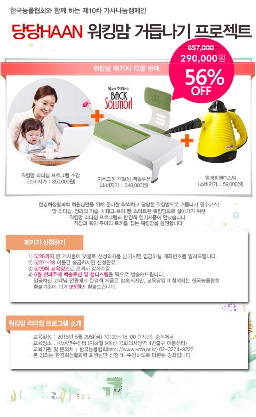 한경희생활과학의 '제 10차 가사 나눔 캠페인' 일환으로 진행되는 이번 프로젝트는 가정과 직장을 오가는 '슈퍼우먼' 워킹맘들을 위한 이벤트로, 한국능률협회에서 진행하는 '워킹맘 리더십 프로그램'과 한경희생활과학 자세교정 책걸상 백솔루션, 한경희 핸디스팀으로 구성된 657,000원 상당의 패키지를 56% 할인된 가격인 29만원에 판매한다.