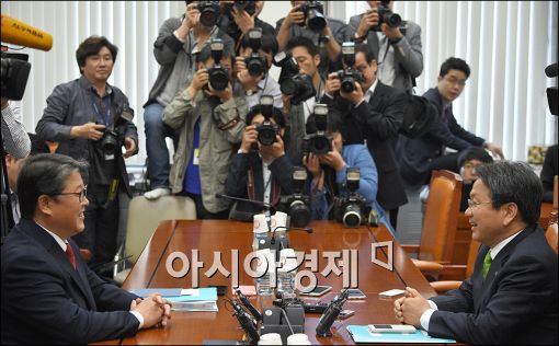 [아시아경제 윤동주 기자] 국회 공무원연금개혁특위 여야 간사인 조원진 새누리당 의원(왼쪽)과 강기정 새정치민주연합 의원이 20일 서울 여의도 국회에서 공무원연금개혁 및 국민연금 관련 논의를 하기 위해 만나고 있다.