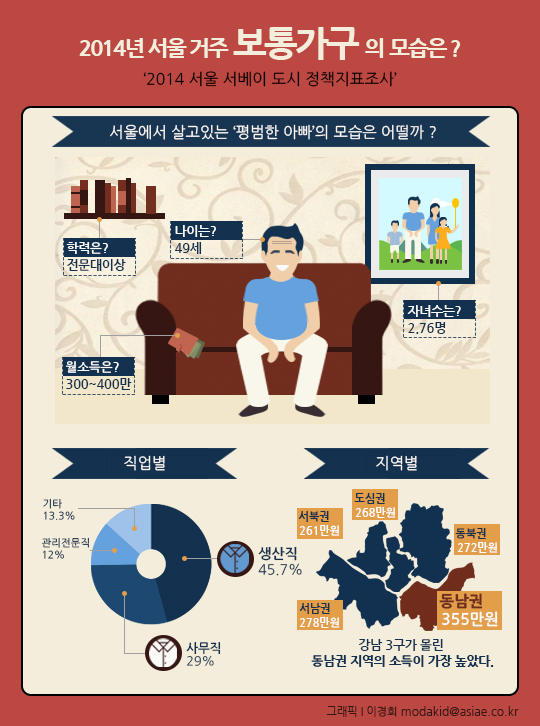 2014년 서울에서 살고 있는 평균적인 가정의 모습은 어떨까? 49세 전문대를 졸업한 남자가 가구주로, 평균 가족수는 2.65명, 월평균 소득은 300만~400만원 정도인 것으로 나타났다.