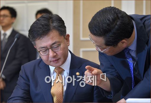 [아시아경제 윤동주 기자] 홍용표 통일부 장관이 22일 서울 여의도 국회에서 열린 '남북관계 대책' 당정협의에 참석, 회의 시작 전 통일부 관계자에게 보고를 받고 있다. 이날 당정에서는 북한의 반기문 UN사무총장의 개성공단 방문 불허, 개성공단 임금문제등이 논의 됐다.