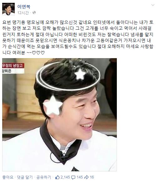 이연복 셰프는 26일 오후 자신의 페이스북에 "요번 맹기용 맹모닝에 오해가 많으신 것 같네요. 인터넷에서 돌아다니는 내가 토하는 장면 보고 저도 깜짝 놀랐습니다. 그건 고개를 너무 숙이고 먹어서 사레 걸린거지 토하는 게 절대 아닙니다"는 글을 올렸다.