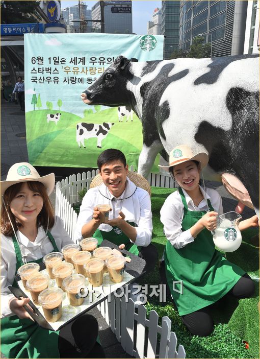 [아시아경제 윤동주 기자] 세계 우유의 날을 맞아 스타벅스는 31일 서울 중구 명동에서 '우유사랑라떼' 캠페인의 일환으로 바리스타들이 실제 크기의 젓소 모형에서 우유를 짜는 퍼포먼스를 선보이고 있다. 이날 스타벅스는 명동을 찾은 시민 300여명에게 '우유사랑라떼'를 무료로 증정했다.