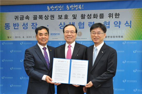 동반성장위원회, 한국조폐공사, (사)한국귀금속판매업중앙회는 3일 서울 구로동 키콕스벤처센터 12층 동반성장위원회 회의실에서 이런 내용을 담은 ‘귀금속골목상권 보호 및 활성화를 위한 동반성장·상생협력 협약식’을 가졌다.