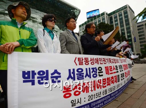 [아시아경제 백소아 기자] 5일 서울 중구 서울시청 앞에서 탈동성애인권기독교협의회 회원들이 기자회견을 열어 중동호흡기증후군(MERS·메르스) 확산방지를 위해 동성애 퀴어문화축제 전면 취소를 촉구하고 있다. 퀴어문화축제는 성소수자 및 지지자들의 인권 보장 실현을 위해 열리는 행사로 오는 9일 서울광장에서 개막할 예정이다.