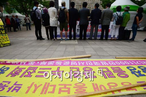 [아시아경제 백소아 기자] 5일 서울 중구 서울시청 앞에서 탈동성애인권기독교협의회 회원들이 기자회견을 열어 중동호흡기증후군(MERS·메르스) 확산방지를 위해 동성애 퀴어문화축제 전면 취소해 줄 것을 촉구하고 있다. 퀴어문화축제는 성소수자 및 지지자들의 인권 보장 실현을 위해 열리는 행사로 오는 9일 서울광장에서 개막할 예정이다.