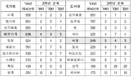 이번 국제협회연합 발표 자료에 따르면 한국은 지난 해 총 636건의 국제회의를 개최해 세계 4위를 차지했다. 한국은 2012년 5위(563건), 2013년 3위(635건)에 이어 3년 연속 세계 5위권 내 수준을 달성했다. 아시아에서는 싱가포르에 이어 2위를 차지함으로써 국제회의 주요 개최국으로서의 입지를 다졌다.