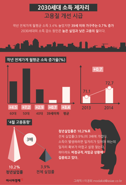 7일 통계청에 따르면 지난해 전체가계 월평균 소득 증가율은 평균 3.4%였으나 39세 이하는 0.7%(433만9612원)에 그쳤다. 다른 연령대에 비해 소득 증가율이 무척 낮은 수준이다. 39세 이하 가구주의 올 1분기 평균소비성향 역시 70.8%로 60세 이상 가구주를 제외하고 전 연령층에서 가장 낮았다.