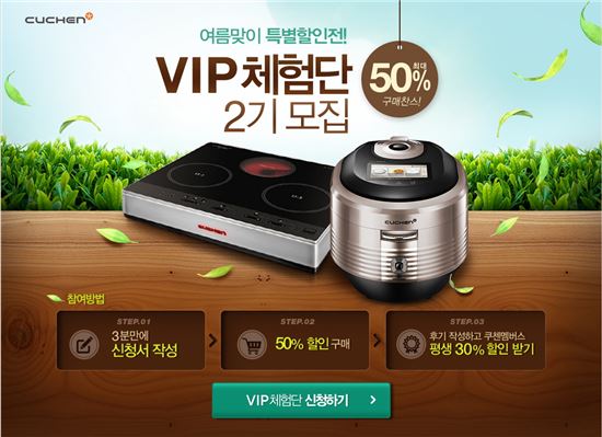 리홈쿠첸샵(www.cuchenshop.com)에서 VIP체험단 신청 양식을 작성하면 3일 내 당첨 문자와 이메일이 발송되고 이후 리홈쿠첸샵을 통해 제품을 구매할 수 있다. 쿠첸멤버스가 되기 위해서는 오는 8월2일까지 사진과 함께 사용후기를 게재하고, 블로그나 까페 2곳 이상에 후기를 올린 후 URL을 남겨야 한다.