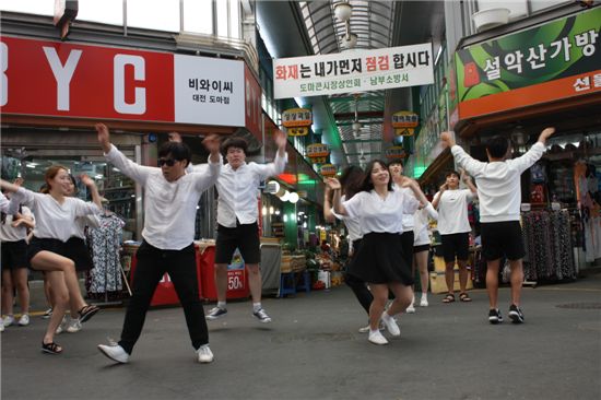 10여명의 남녀대학생들은 가게 앞에서 경쾌한 춤과 몸짓으로 시장이 살아 꿈틀대는 분위기를 연출했고 정육점에선 벽에 걸려있는 고기와 저울을 배경으로 동영상을 찍기도 했다.