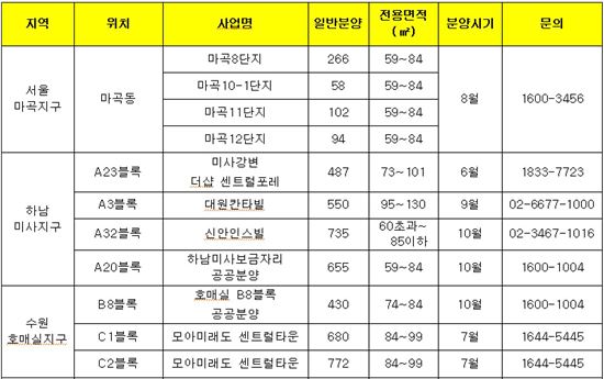 서울에서는 SH공사가 오는 8월 마곡지구에서 공공분양 4곳, 520가구를 공급한다. 모두 전용면적 85㎡ 이하다. 서울의 마지막 택지지구인 마곡은 지하철 9호선과 5호선, 공항철도가 지나는 트리플 역세권으로 LG그룹, 대우조선해양, 코오롱 등 대기업들이 입주 예정이다.