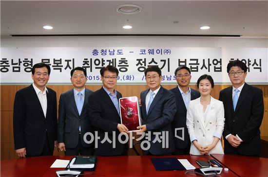 [아시아경제 이창환 기자] 환경가전서비스기업 코웨이와 충청남도는 2020년까지 도내 상수도 미보급 지역 취약계층의 물 복지 향상을 위해 정수기를 지원하는 ‘안전한 먹는 물 이용을 위한 역삼투압 정수기 지원 사업’ 협약을 체결했다고 10일 밝혔다.