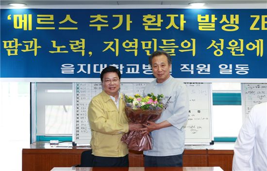 권 시장은 23일 오후 을지대학병원을 찾아 황인택 병원장에게 축하꽃다발을 전하며 의료진들을 격려했다.