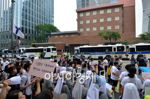 [아시아경제 최우창 기자] 24일 오후 서울 중학동 일본대사관 앞에서 일본군 위안부 문제 해결을 위한 정기수요집회에서 열리고 있다.