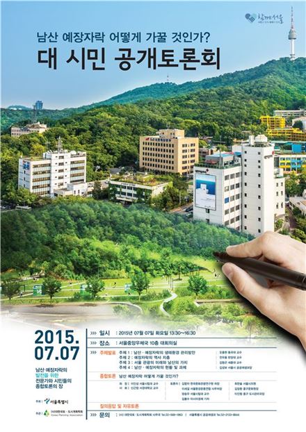 [아시아경제 조인경 기자] 서울시가 다음달 7일 서울중앙우체국(중구 명동 소재) 10층 대회의실에서 '남산 예장자락, 어떻게 가꿀 것인가?'를 주제로 대시민 공개토론회를 개최한다고 29일 밝혔다.