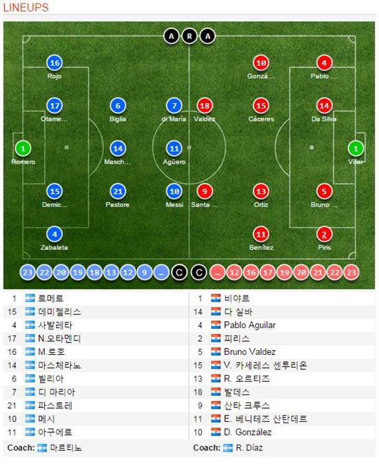 공격진에 리오넬 메시, 앙헬 디마리아, 세르히오 아구에로가 쓰리톱으로 출격한다. 미드필드에 하비에르 파스토레, 하비에르 마스체라노, 루카스 비글리아가 출전한다.