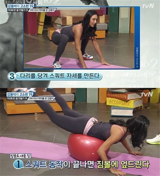 정아름은 "짐볼을 들면 체중을 뒤에 싣기가 수월해 스쿼트 자세를 효과적으로 취할 수 있다"고 설명했다.