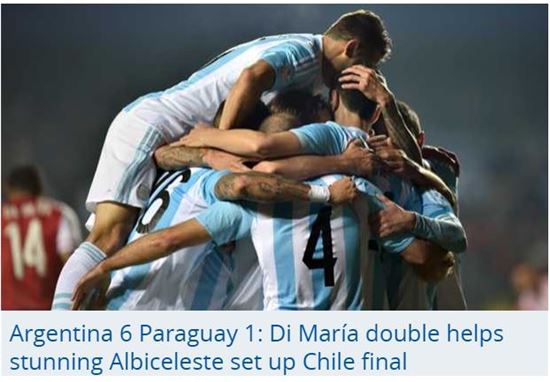 [아시아경제 온라인이슈팀] 아르헨티나가 파라과이에 6대 1 대승을 거뒀다. 칠레와 남미 최강을 가리는 결승전을 펼칠 상대는 아르헨티나가 됐다. 메시는 자신의 첫 메이저 대회 우승에 도전한다.