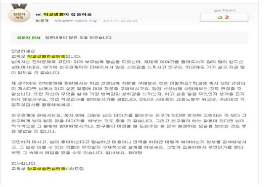 학교생활에 어려움을 겪는 학생과 학부모들은 '네이버 지식 iN 서비스>지식 Q&A>교육,학문 디렉토리 및 하위 디렉토리'에 고민을 질문하면 각 분야의 상담 전문가의 답변을 들을 수 있다.