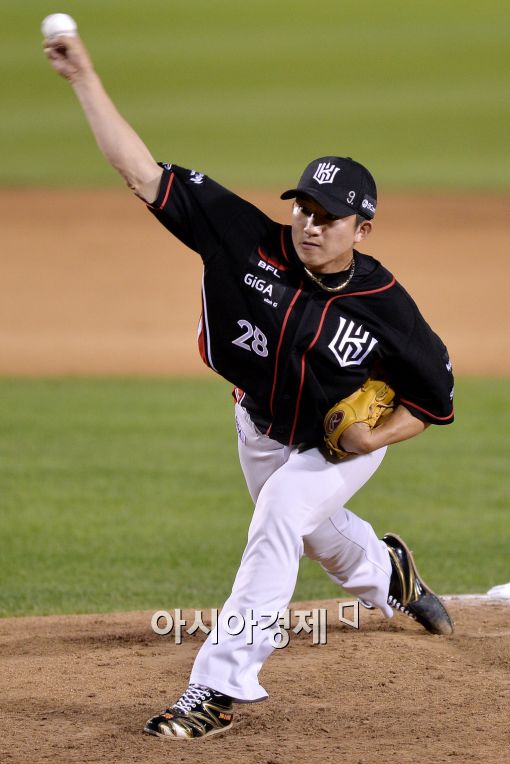 [잠실=아시아경제 김현민 기자] 2015 KBO리그 kt 위즈와 두산 베어스의 경기가 16일 잠실야구장에서 열렸다. 8회말 kt의 세 번째 투수 장시환이 역투하고 있다.