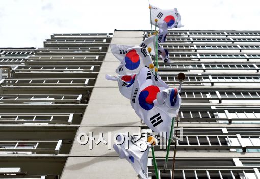 [아시아경제 최우창 기자] 제67주년 제헌절인 17일 서울 강남구 삼성동 한 아파트에 태극기들이 게양되어 펄럭이고 있다.