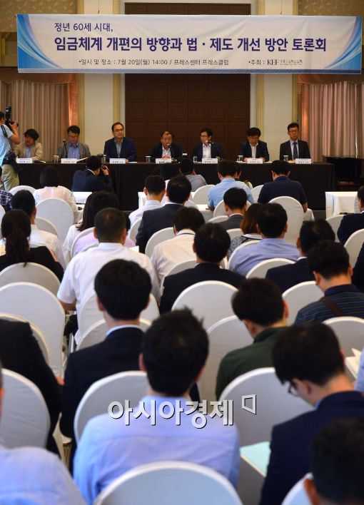 [아시아경제 백소아 기자] 20일 서울 태평로 프레스센터에서 열린 '정년 60세 시대, 임금체계 개편의 방향과 법·제도 개선 방안 토론회'에서 이장원 한국노동연구원 임금직무센터 소장(왼쪽부터 세 번째)이 '임금체계 개편 방안과 정책방안'을 주제로 발제를 하고 있다. (왼쪽부터)권순원 숙명여대 교수, 김동배 인천대 교수, 이 소장, 이수봉 한국기술교육대 교수, 박우성 경희대 교수, 이지만 연세대 교수, 하상우 한국경영자총협회 팀장