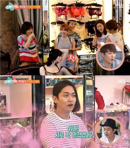 21일 오후 방송된 SBS 예능프로그램 '썸남썸녀'에서는 강균성이 서인영과 김정난, 채정안, 이수경 등과 함께 속옷 가게를 찾는 모습이 그려졌다.