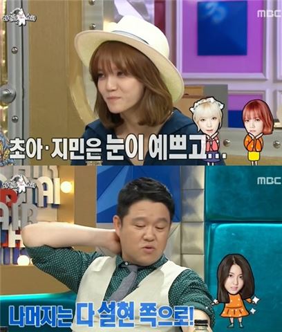 김구라는 "초아와 지민은 눈이 예쁘다. 설현은 나머지 모든 게 다 예쁘다"고 정리해 출연진을 폭소케 했다.