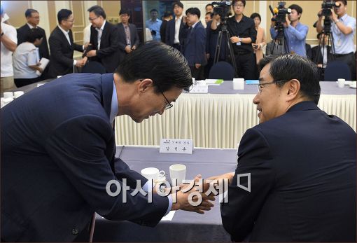 [아시아경제 윤동주 기자] 김정훈 새누리당 정책위의장이 23일 서울 여의도 국회에서 열린 '농업정책자금 금리 인하를 위한 당정협의'에서 방문규 기재부 차관과 인사를 나누고 있다.