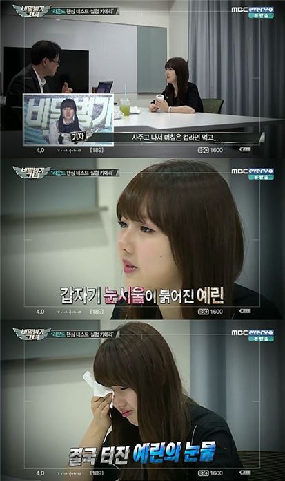 이날 방송에선 여자친구 예린을 비롯한 다양한 걸그룹 멤버들은 몰래카메라로 '팬심 테스트'를 받았다. 기자로 위장한 연기자의 황당한 부탁들을 어디까지 수락하는지 알아보는 테스트였다.