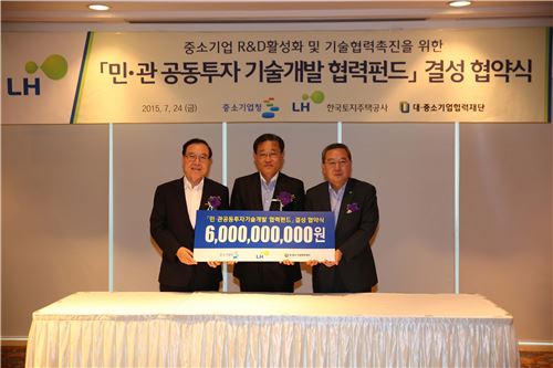 LH는 지난 24일 중소기업청, 대·중소기업협력재단과 '민·관 공동투자 기술개발 협력펀드' 결성 협약을 체결했다고 26일 밝혔다. LH와 중소기업청이 협력펀드를 공동 조성해 중소기업의 기술개발 비용을 지원하기 위한 것이다.