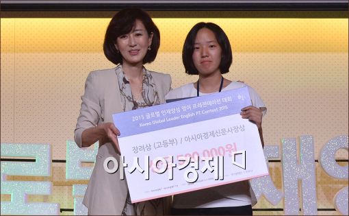 [아시아경제 윤동주 기자] 아시아경제신문, 아시아경제TV, 에듀아시아 주최로 25일 서울 중구 페럼타워에서 열린 '2015 글로벌인재 양성 영어 프레젠테이션 대회'에서 고등부 부문 장려상을 수상한 제경현 민족사관고등학교 학생이 수상 후 임종령 서울외국어대학원대학교 교수(심사위원장)와 기념사진을 찍고 있다.