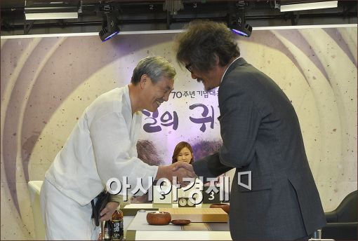 [아시아경제 윤동주 기자] 현대바둑 70주년을 기념해 26일 서울 성동구 한국기원에서 열린 조훈현, 조치훈 9단 특별대국이 열렸다. 대국 시작에 앞서 조훈현, 조치훈 9단이 인사를 나누고 있다.