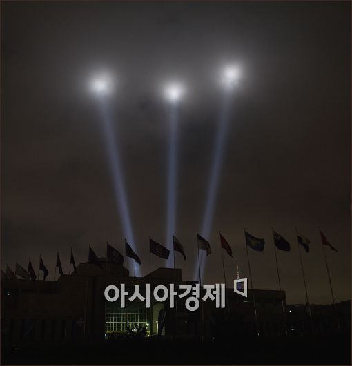 [아시아경제 윤동주 기자] 27일 6ㆍ25 정전협정 체결 62주년이자 '유엔군 참전의 날'을 맞아 전쟁기념관에서 '호국', '보훈', '통일'을 상징하는 빛줄기를 상공으.
