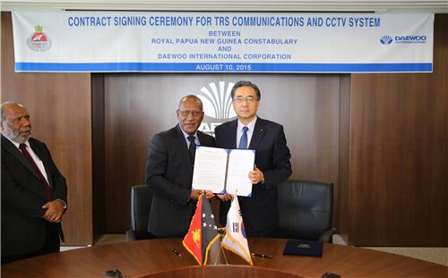 [아시아경제 김혜민 기자] 대우인터내셔널은 10일 인천 송도사옥에서 파푸아뉴기니 경찰청과 4000만 달러 규모의 파푸아뉴기니 경찰통신망 및 CCTV 구축 사업 계약을 체결했다. 사진 가운데 왼쪽 가리 바키(Gari L. Baki) 파푸아뉴기니 경찰청장, 가운데 오른쪽 김영상 대우인터내셔널 사장