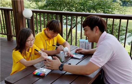 13일 충북 제천 청풍리조트에서, LS드림캠프에 참가한 초등학생과 대학생 멘토가 함께 장래희망을 인형에 그리는 무스토이 만들기를 하고 있다. (사진제공 : LS그룹)