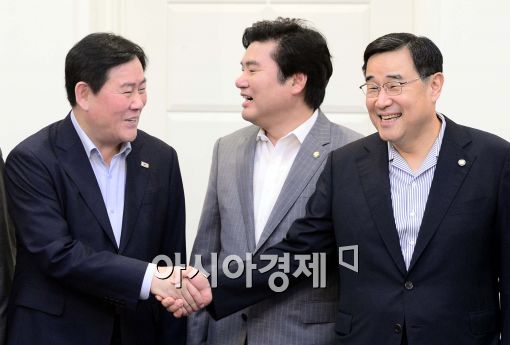 [아시아경제 최우창 기자] 13일 서울 여의도 국회 귀빈식당에서 열린 2016년도 예산안 당정협의에서 최경환(왼쪽부터) 경제부총리 겸 기획재정부 장관과 새누리당.