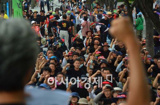 [아시아경제 백소아 기자] 28일 서울 종로구 세종로소공원에서 열린 건설노동자결의대회에서 참가자들이 임을 위한 행진곡을 부르고 있다.