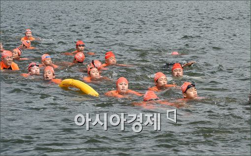 [아시아경제 윤동주 기자] 6일 서울 송파구 잠실한강공원에서 열린 '잠실송파나루 한강건너기 수영대회'에 참석한 참가자들이 역영을 하고 있다.
