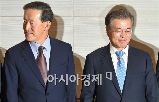 [아시아경제 윤동주 기자] 문재인 새정치민주연합 대표와 허창수 전경련 회장이 8일 서울 여의도 전경련 회관에서 열린 정책간담회에 참석, 인사를 나눈 후 자리에 앉고 있다.