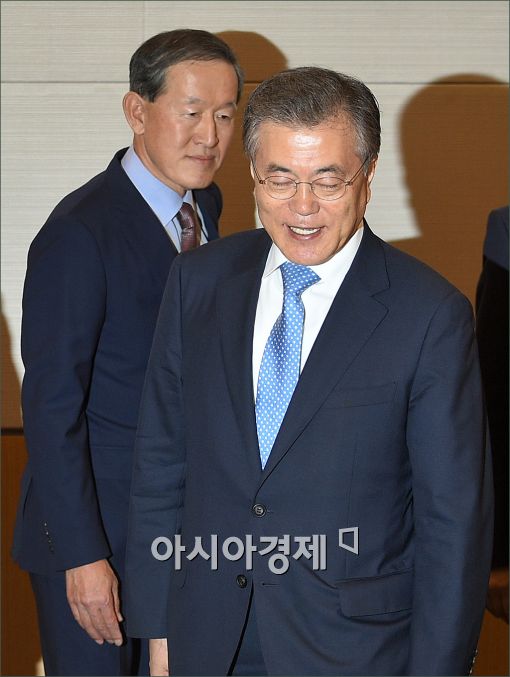 [아시아경제 윤동주 기자] 문재인 새정치민주연합 대표와 이종걸 원내대표, 허창수 전경련 회장이 8일 서울 여의도 전경련 회관에서 열린 정책간담회에 참석, 인사를 나눈 후 자리에 앉고 있다.