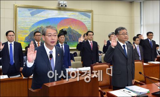 [아시아경제 윤동주 기자] 임종룡 금융위원장이 14일 서울 여의도 국회에서 열린 국회 정무위원회의 금유위원회의에 대한 국정감사에 출석, 증인선서를 하고 있다.
