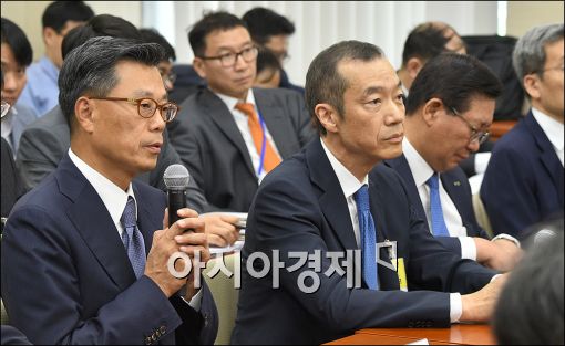 [아시아경제 윤동주 기자] 조대식 SK주식회사 대표가 14일 국회 정무위원회의 금융위원회에 대한 국정감사에 일반증인으로 출석, 의원들 질의에 답변하고 있다.