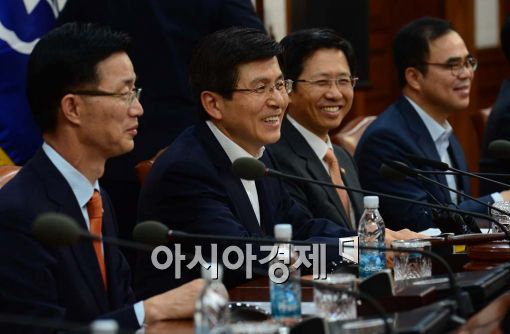 [아시아경제 백소아 기자] 16일 서울 세종로 정부서울청사에서 청년일자리펀드 조성 및 활용방안 관련 발표 전 황교안 총리(왼쪽부터 두 번째)를 비롯한 국무위원들이 밝게 웃고 있다. 이날 박근혜 대통령은 청년펀드에 2000만원을 기부하고 월급에서 매달 20%씩 기부할 의사를 밝혔다. 방문규 기획재정부 차관, 황 총리, 김재춘 교육부 차관, 김종 문체부 차관(왼쪽부터)