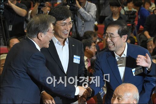 [아시아경제 윤동주 기자] 문재인 새정치민주연합 대표가 16일 서울 여의도 국회에서 열린 중앙위원회의에 참석, 박원순 서울시장과 인사를 나누고 있다.