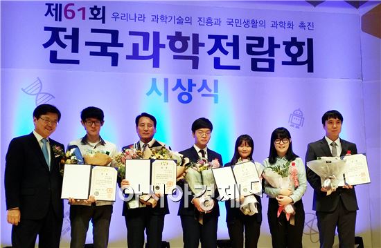 [아시아경제 노해섭 기자]전라남도교육청(교육감 장만채)은 미래창조과학부가 주최하고 국립중앙과학관이 주관한 2015년 제 61회 전국과학전람회에서 대통령상 1명과 최우수상 2팀, 특상 8팀, 장려상 7팀 등을 수상하여 수상대상자 17팀의 학생, 교원 등이 오늘 국립중앙과학관 사이언스홀에서 열리는 시상식에 참여했다.