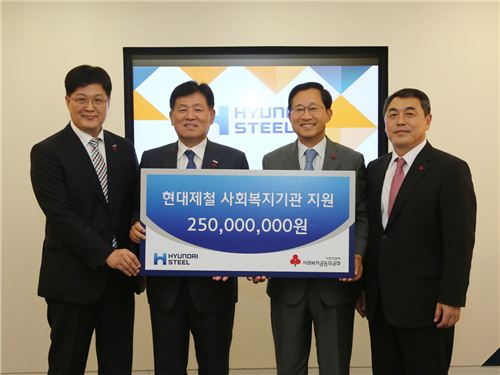 $pos="C";$title="현대제철";$txt="▲22일 서울 중구 정동 사회복지공동모금회에서 현대제철 강학서 사장(사진 왼쪽에서 두번째)이 추석맞이 사회복지기관 기금을 사회복지공동모금회 김주현 사무총장(사진 왼쪽에서 세번째)에게 전달하고 있다.