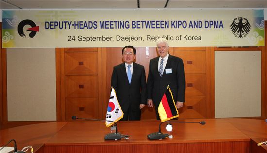 [아시아경제(대전) 정일웅 기자] 특허청은 24일 정부대전청사에서 ‘한-독 특허청 차장 회의’를 개최했다. 회의는 한국과 독일 양국 간 특허시스템 교류방안과 협력을 논의하는 자리로 마련됐다. 특허청 이준석 차장(왼쪽 첫 번째)와 독일 특허청 군터 슈미츠 차장(왼쪽 두 번째)이 회의를 마치고 기념사진을 찍고 있다.