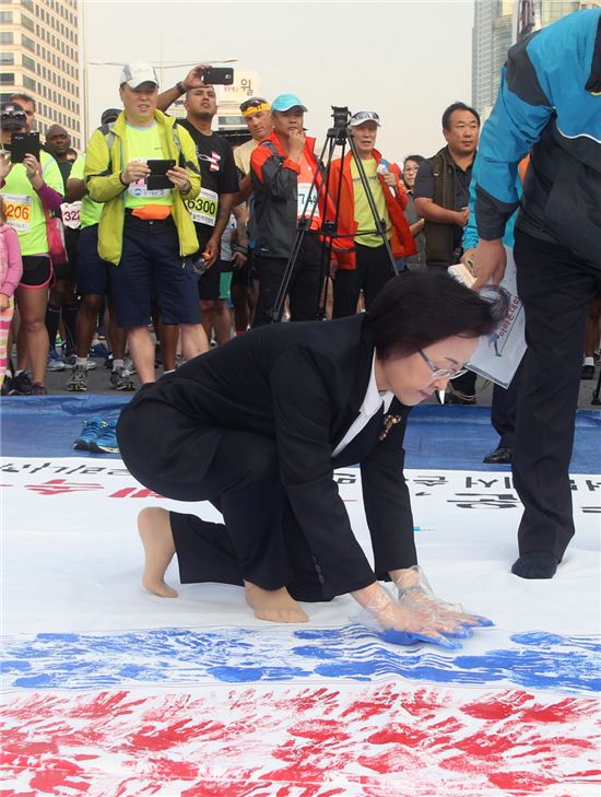 신연희 강남구청장이 3일 오전 8시 서울 강남구 영동대로에서 열린 ‘제13회 국제 평화마라톤 대회’에 참석해 참가자들과 함께 대형 데니태극기 만들기를 만들고 있다.