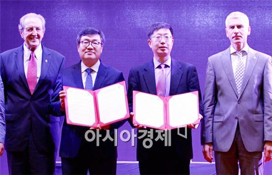 끌로드 루이 갈랭 FISU회장(왼쪽)과 올렉 마티신 수석 부회장 등 30여 개국의 FISU 대표가 참가한 가운데 중국 샤먼시 로얄호텔 대회의실 열린 이번 세미나 폐막식 식전 메인행사로 마련된 협약식에서 호남대학교와 중국대학생 체육연맹은 축구를 통한 한중체육교류에 적극 나서기로 했다.