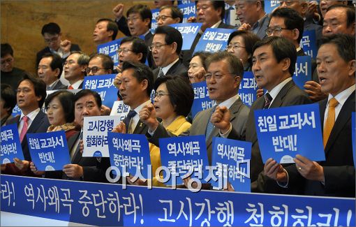 [아시아경제 윤동주 기자] 문재인 새정치민주연합 대표 등 당 소속 의원들이 12일 국회 로덴더홀 계단에서 '역사교과서 국정화 시도 규탄대회'를 갖고 있다.